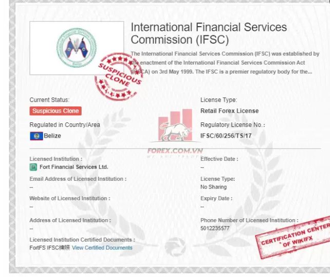 Mặc dù FortFS là một nhà môi giới ECN hợp pháp nhưng nó không có được giấy phép của 2 cơ quan quản lý tài chính hàng đầu hiện nay, chính vì như vậy sàn FortFS không được khách hàng yên tâm khi chọn làm sàn đầu tư của mình. Tuy nhiên sàn được đăng ký ở nước ngoài tại Saint Vincent và Grenadines.