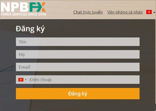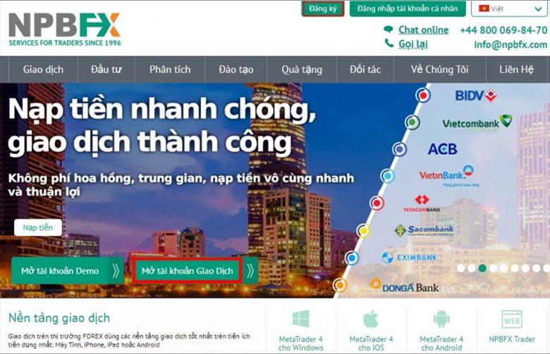 Tại giao diện chính của NPBFX bấm vào đăng ký hoặc mở tài khoản giao dịch.